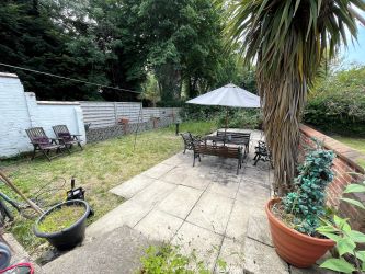 Garden to the rear. Paved patio. Lawn. Walling and fencing. Fire Exit staircase, leading to the second floor landing.