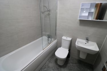 Having white suite with shower over, low flush WC, wash hand basin and electric heated towel rail