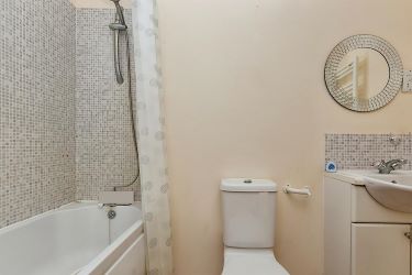 Bath with mixer taps and overhead shower, WC, basin, airing cupboard.