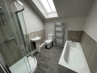 Bathroom - Panelled Bath. Separate shower cubicle. Pedestal wash hand basin. Low level W.C. Skylight. Heated towel rail.