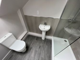En-Suite - Double shower cubicle. Pedestal wash hand basin. Low level W.C. Skylight. Heated towel rail.