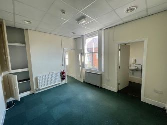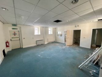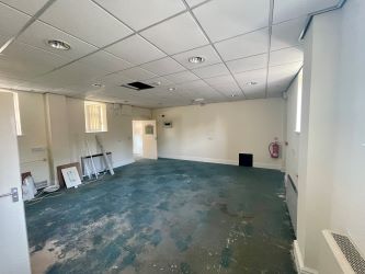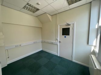 This large room is decorated with white painted walls and green carpet tiles. Four large windows fill the room with natural light. Leading on from these are a kitchen, a shower room and a separate WC.