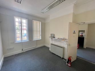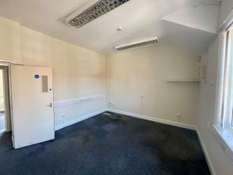 Decorated with white painted walls and grey carpet tiles. Two large windows face the front of the property.