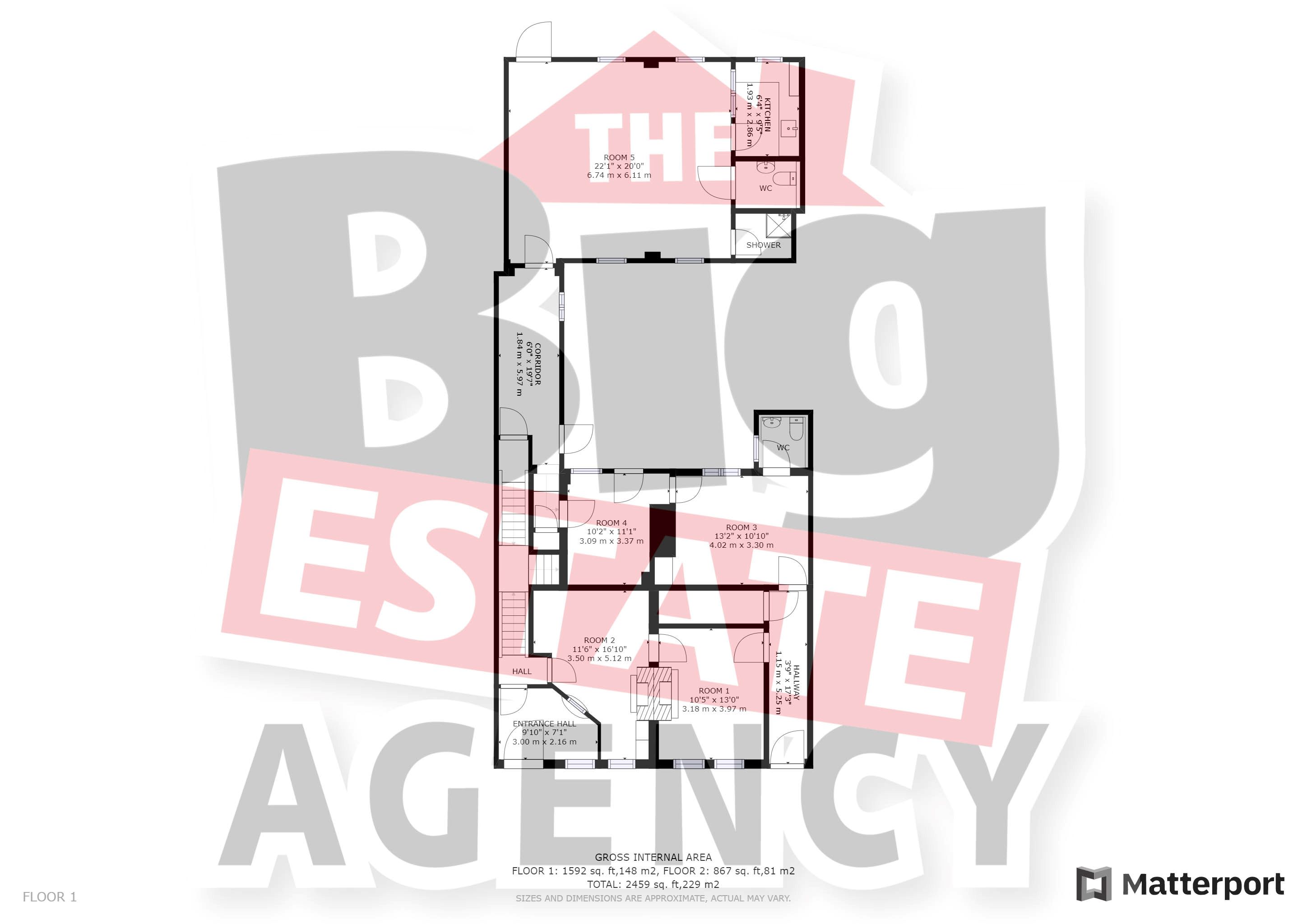 This large hallway takes you to through to room 3. Decorated with white painted walls and green carpet.