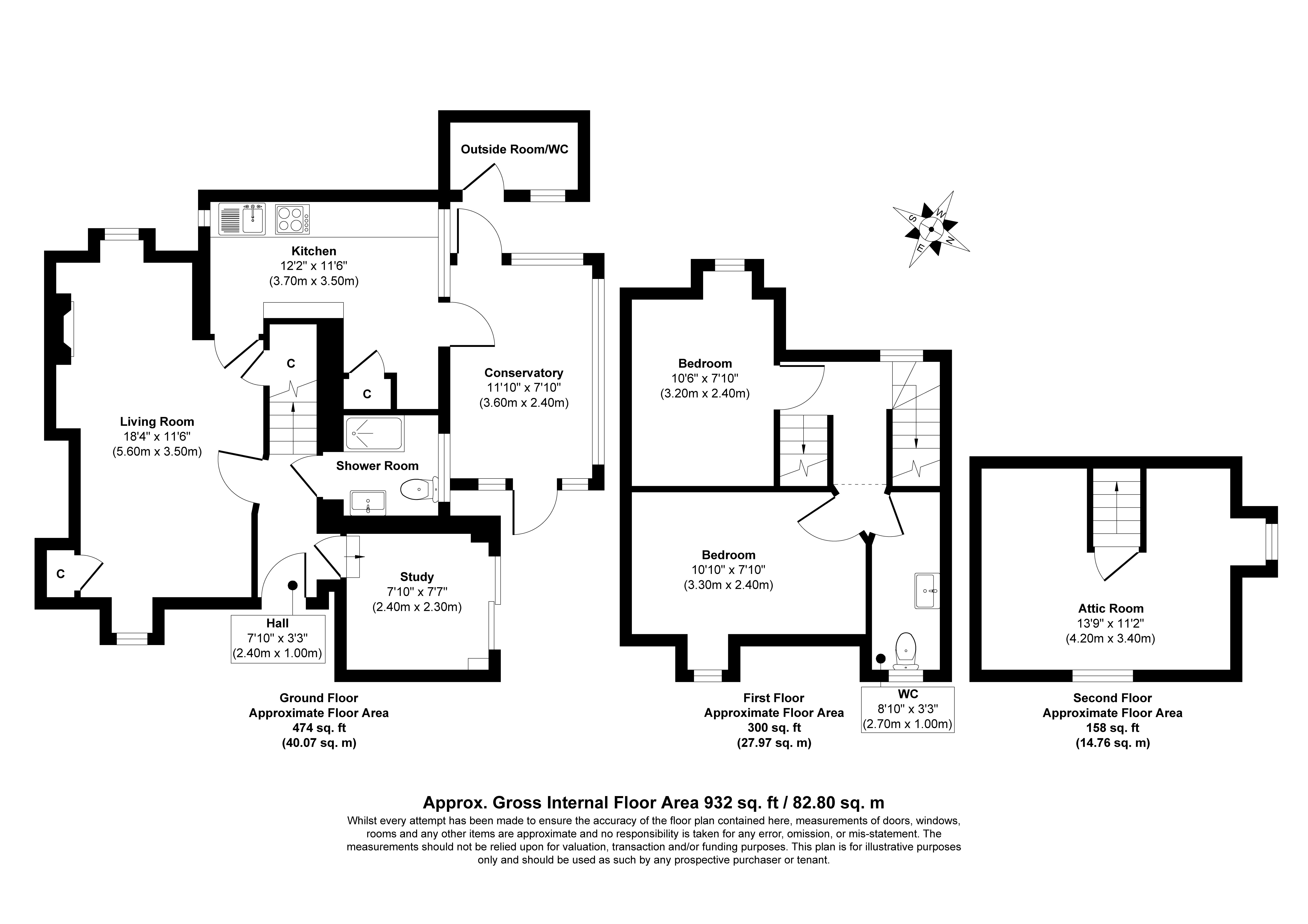 Hall. Lounge/Diner. Kitchen. Conservatory, utility, outside toilet and, small rear yard. Shower room. Bedroom. On the first floor: Two bedrooms. Loft room. Gardens to the front and side with delightful views.