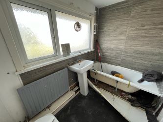 UPVC double glazed window to the front elevation, bathroom suite comprising of WC, pedestal wash handbasin, bath with tiled splashbacks and radiator.