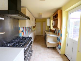 KITCHEN/DINER: 22'10" x 6'4" (6.96m x 1.93m), Stainless steel sink unit with cupboards below, range of base and wall storage units, working surfaces. Plumbing for washing machine, uPVC double glazing, central heating radiator. Range gas cooker with extractor hood, tiled floor, store, central heating boiler.