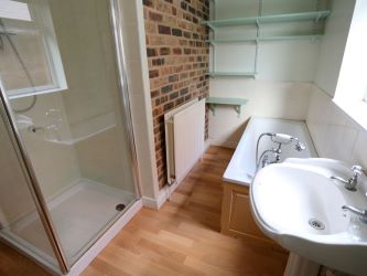 BATHROOM/WC: 11'2" x 4'5" (3.40m x 1.35m), Panelled bath, shower cubicle, low level WC, pedestal wash hand basin, central heating radiator, uPVC double glazing, laminate flooring.