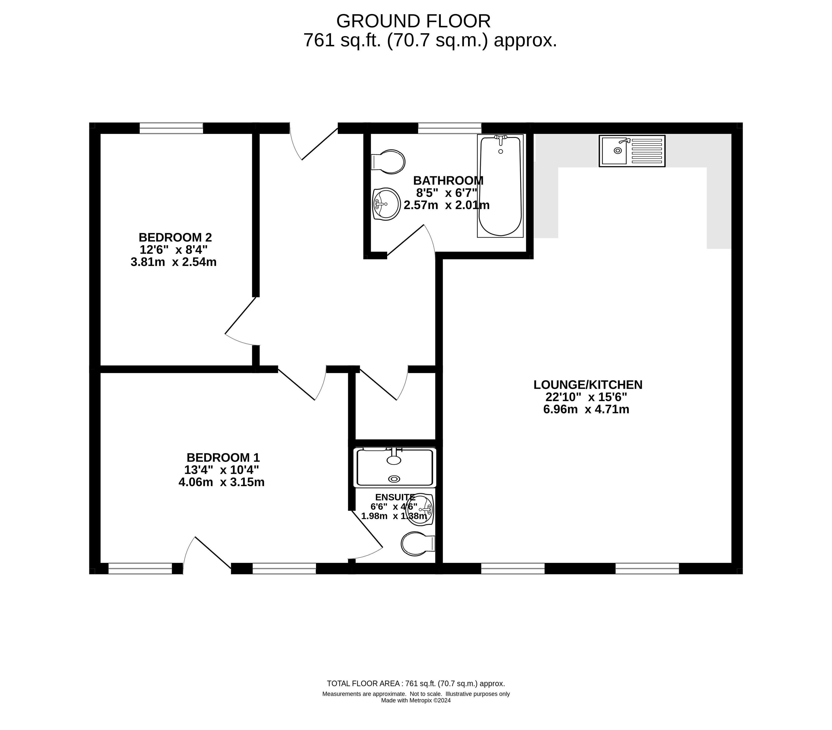 Accommodation Hall, lounge/kitchen, bed 1 with en-suite shower bed 2 and a bathroom.