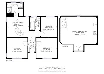 Ground Floor Hallway, three bedrooms, rear hallway/stairs, two bathrooms.