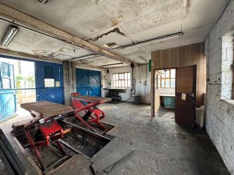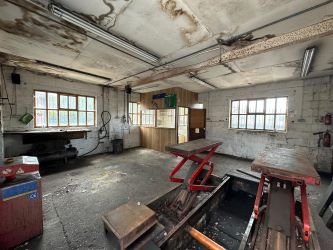 A traditionally constructed and detached workshop premises formerly occupied as a motor vehicle repair garage and comprising a traditional brick-built building with flat roof along with concrete/tarmacadam small forecourt. Internally three separate double timber doors give access to the premises currently configured as two workshop bays and small ancillary office area. Three phase power to the building and shallow mechanic’s pit. The gross internal floor space is 6.55m x 6.65m and an additional 4.37m x 9.80m.