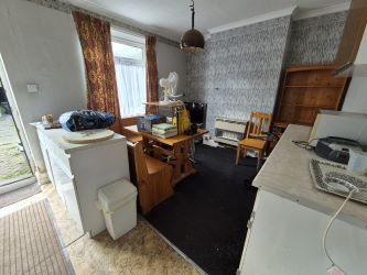 With a basic range of units including a stainless steel sink, base and wall cupboards, pantry cupboard, gas fire with back boiler for the central heating, single radiator and rear entrance door.