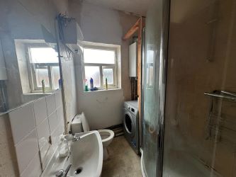 Low level flush W.C, pedestal wash hand basin, corner framed shower cubicle, space and provision for automatic washing machine and wall mounted gas boiler.