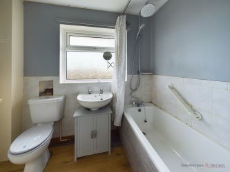 With a three-piece suite including an encased bath fitted with an over bath shower and curtain, pedestal wash hand basin, low level WC, half tiled walls and a single radiator.