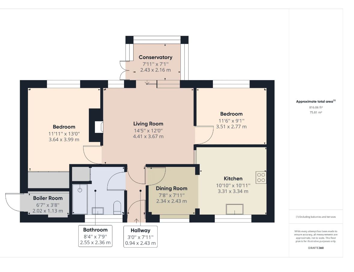 With accommodation comprising central entrance hallway, front kitchen diner and modern shower room, leading through to a rear living room, two double bedrooms and conservatory. Gardens to the front and rear.