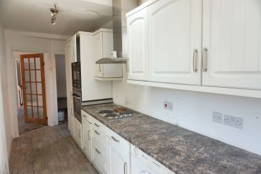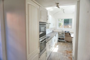 Fitted kitchen with a range of wall and base units with work surfaces over, stainless steel sink and drainer, tiling to splash prone areas, electric oven and hob with cooker hood over, plumbing available for a washing machine and integrated dish washer, central heating radiator, space for a dryer, breakfast bar, extractor fan, built in microwave, sky light. New flooring ( fitted July 2021) Double glazed windows to the rear and side of the property, door leading to the garden.