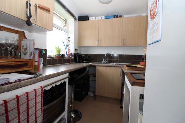 With a double-glazed window to the side elevation, wall and base units, work surfaces, space for fridge-freezer, stainless steel sink, electric oven and vinyl flooring.