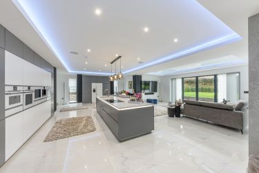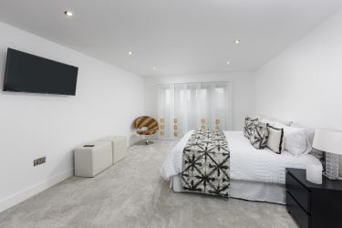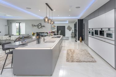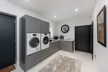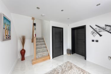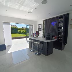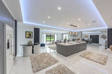 Upon entry, you are welcomed into a breathtaking open galleried space, accentuated by a solid oak and glass staircase and a striking central pendant light, setting the tone for the elegance that permeates the property. The ground floor is designed for both luxury and functionality, featuring multiple reception rooms and an expansive open-plan kitchen/diner/family room. This space is equipped with top-tier Küpperbusch appliances, a Bora induction hob, and a Quooker hot water tap, all leading seamlessly to the rear patio through bifold doors—ideal for entertaining or relaxing in style. The cinema room offers a state-of-the-art, soundproof environment, designed with plush, sound-absorbing wall panels and specialized acoustic treatments, ensuring an immersive audiovisual experience that will impress any audience.