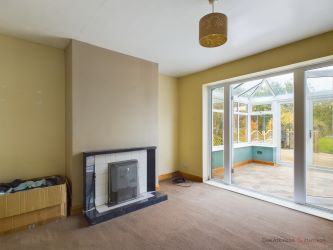 The second reception room leads from the kitchen and has uPVC French doors leading to the conservatory, radiator, and fireplace.