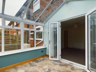 uPVC construction under a pitched roof with tiled flooring and under-floor heating. French doors to the garden.