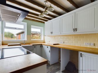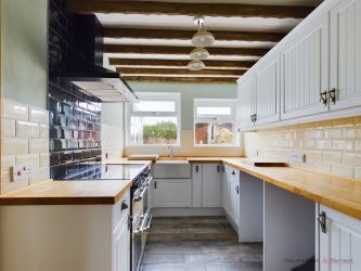 A country-style fitted kitchen with a range of white base and wall units with beech block worktops and complementing wall tiles, with a Belfast sink with mixer tap, free standing range cooker with extraction hood and contrasting tiled backsplash, space/plumbing for a washing machine and dishwasher and with an integrated fridge. With two uPVC windows to the rear aspect, a modern black vertical radiator, wood effect tiled flooring and with decorative ceiling beams.