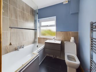 This modern bathroom has a shower bath with an electric shower unit and glass screen, WC, and wall-hung basin. It also has tiled flooring and tiled splashbacks, a towel radiator, and a uPVC window.