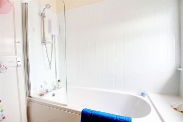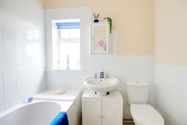 Bathroom: 2.12m x 2.04m (6'11 x 6'8) - Fitted with three piece bathroom suite comprising dual flush wc, pedestal wash hand basin and panelled bath with electric 'Triton' shower over. Part tiled walls. Loft access.