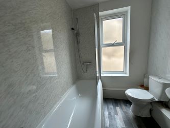 Single glazed casement window to the rear elevation, three piece suite comprising panelled bath with shower over, pedestal wash basin, mid flush w.c., double radiator, part tiled walls.