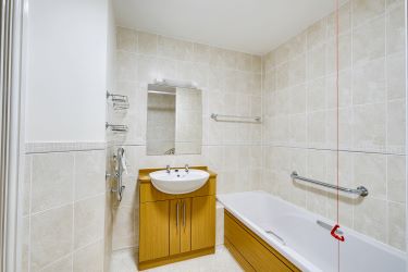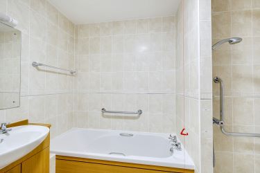 Bathroom - Tiled and fitted with bath and walk-in level access shower. Toilet, vanity unit with sink and mirror above. There are grab rails and non slip flooring. Emergency pull cord.