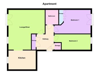 Accommodation Front door leads to Hallway (3.17m x 2.28), containing two storage cupboards. Hallway provides access to Bedroom 1 (3.23m x 4.76m), Bedroom 2 (2.04m x 4.77m), Bathroom (2.10m x 1.68m), and Lounge/Diner (5.35m x 4.81m). Lounge/Diner provides access to Kitchen (2.50m x 3.65m).