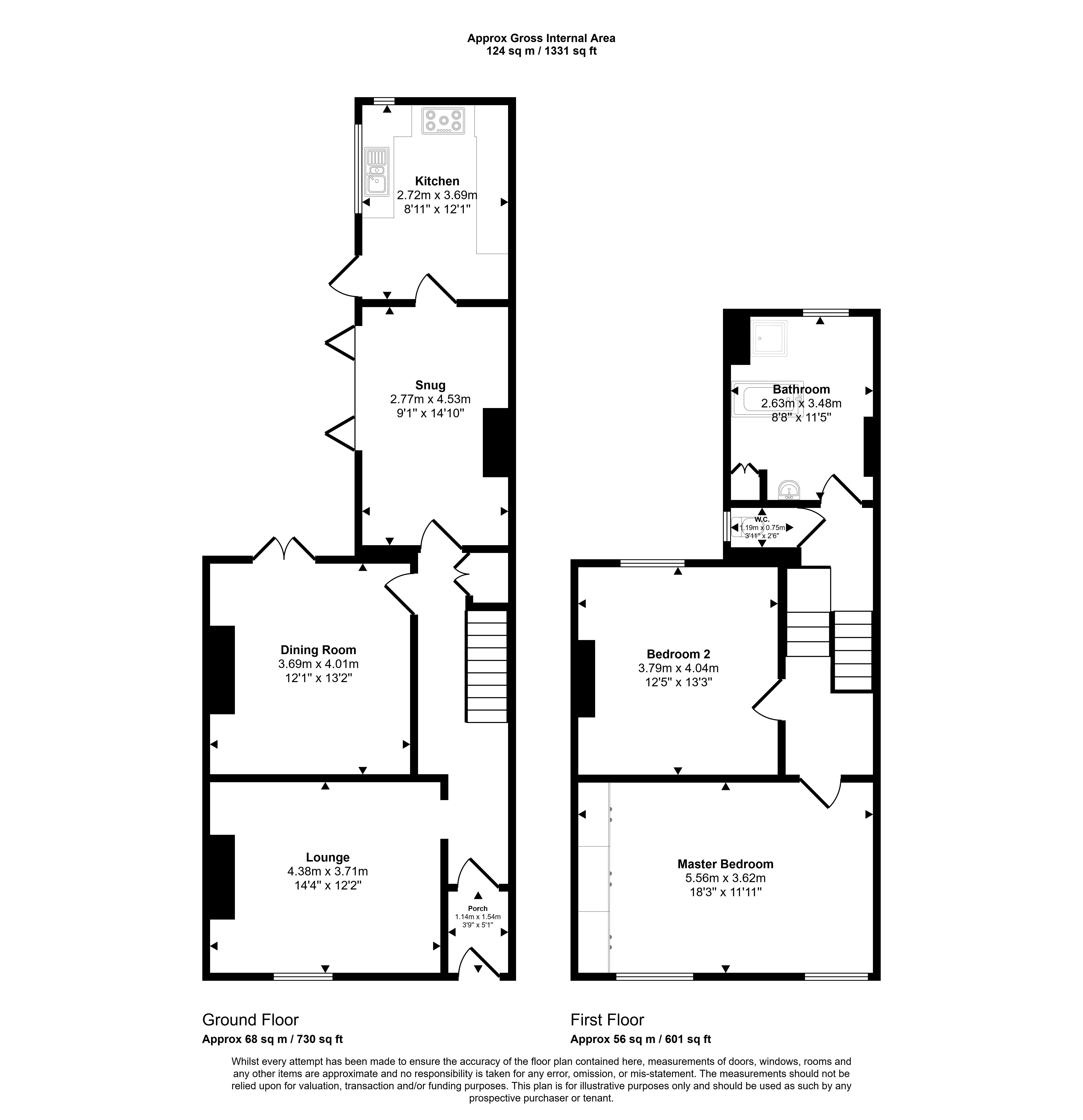The property compromises of an Entrance Hall, a Living Room, a Dining Room, a Snug, and a Kitchen downstairs. On the first floor are two double Bedrooms, a Family Bathroom and a WC.