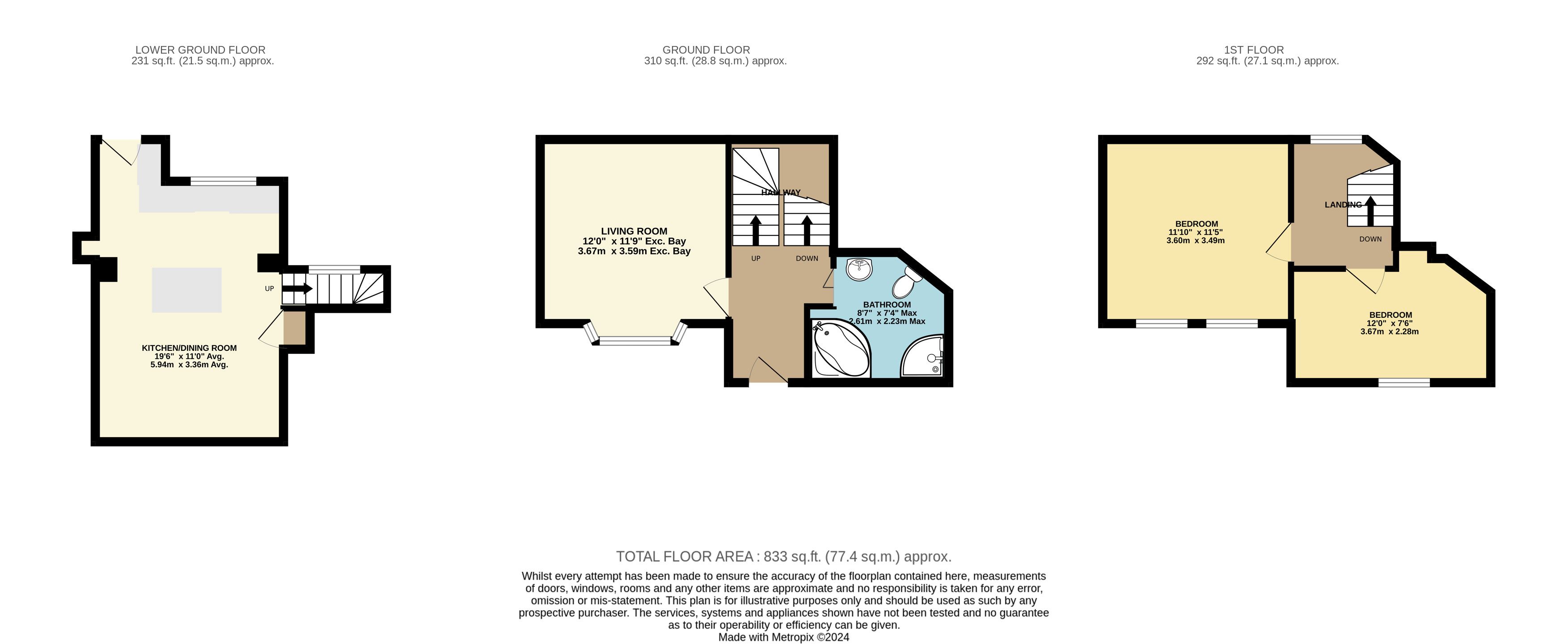 The accommodation briefly comprises an entrance hallway with stairs rising to the first floor and stairs descending to the lower ground floor. Off the entrance hallway, there is a living room and bathroom. The lower ground floor offers an open plan kitchen/dining room with door to the rear courtyard garden. To the first floor there are two bedrooms with front facing aspects.