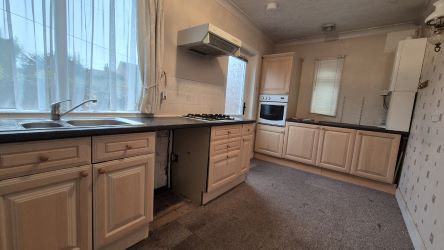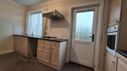 Fitted with a range of base and wall units, one and a half bowl stainless steel sink with mixer tap, electric oven and four-ring gas hob, double radiator, rear entrance door and burglar alarm controls (not tested).