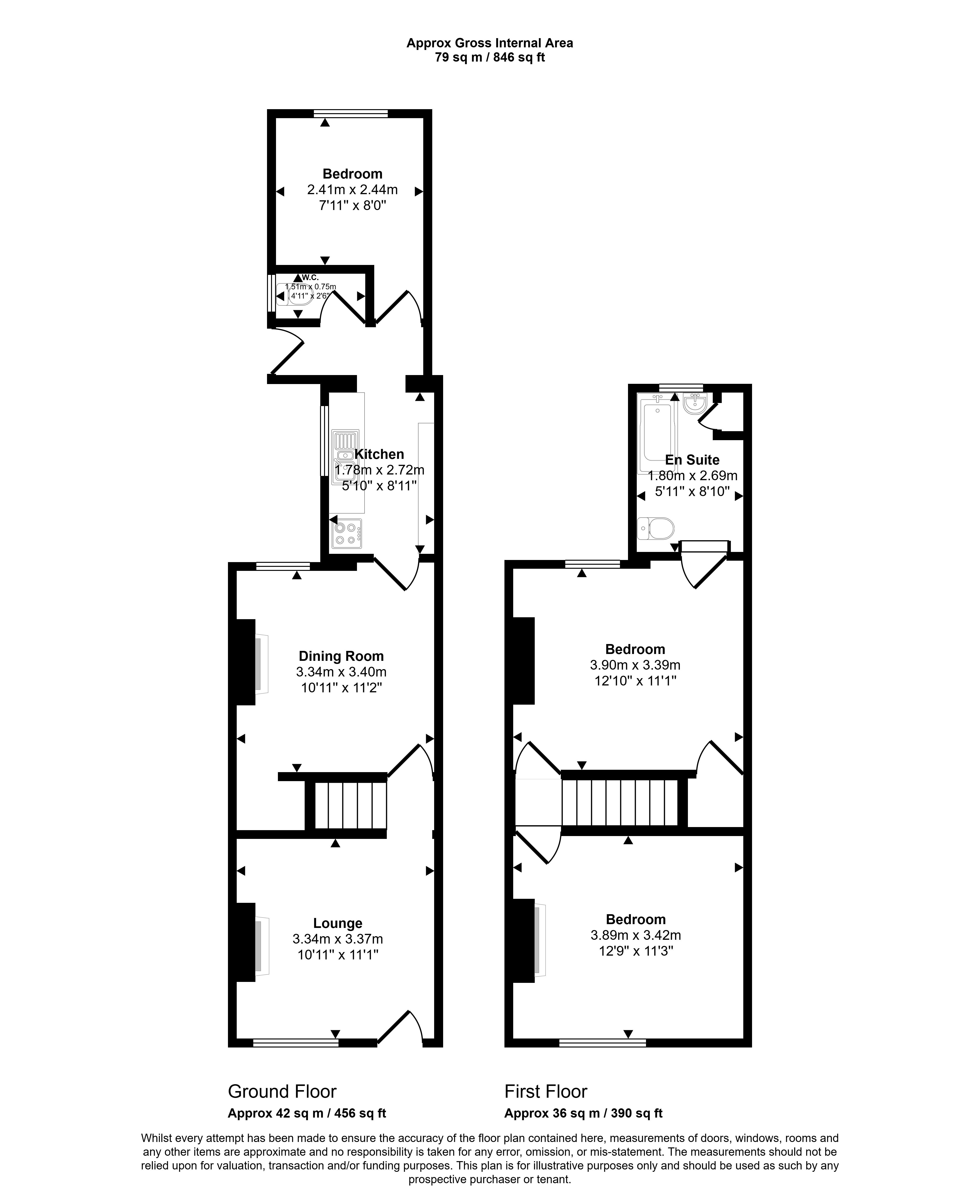 The property has an entrance hall, dining room, study, kitchen, toilet, and a third bedroom to the rear. The first floor offers two spacious double bedrooms and a family bathroom.