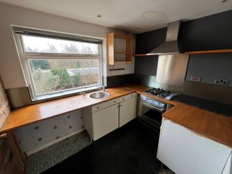 Fitted with wall and base units incorporating matching worktops. The kitchen has a circular stainless-steel sink and drainer with mixer tap and splashback tiling, a four ring gas hob with an extractor hood above, an electric oven and grill, plumbing for a washing machine and an area for a fridge freezer. a brick exposed feature wall, tiled flooring and spotlights to the ceiling, rear facing single glazed window.