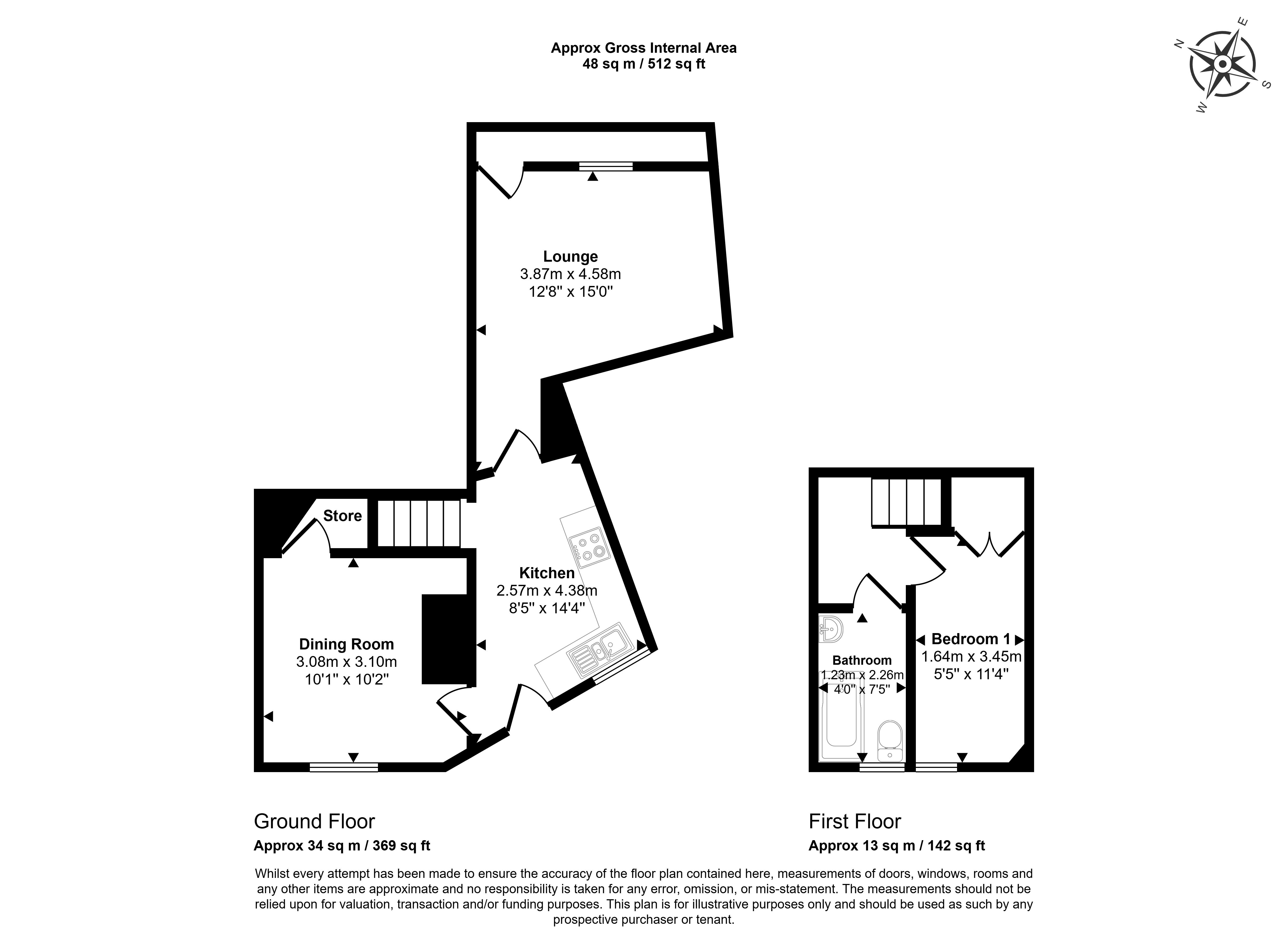 The property compromises of a Living Room, a Kitchen, and a Bedroom/Dining Room to the ground floor. On the first floor is a Bedroom and a Bathroom.