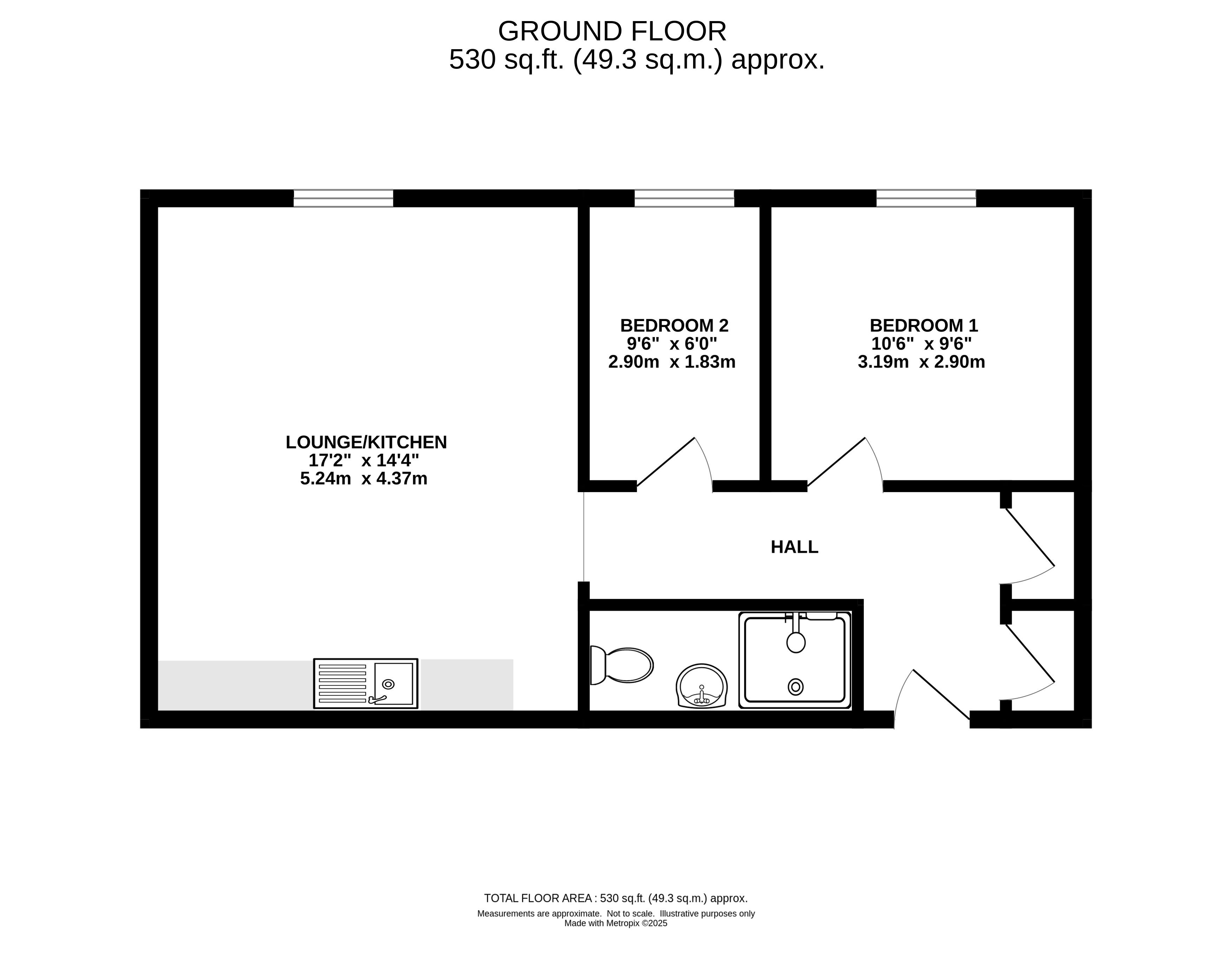 Accommodation Hall, lounge/kitchen, two bedrooms and a shower room.