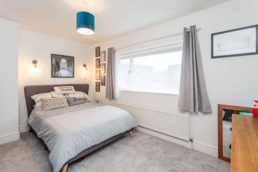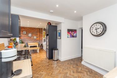 The ground floor has a bright entrance hallway leading to a spacious living room with a front facing window. To the rear, the open plan kitchen and dining area features a modern kitchen, wood flooring, and exposed brick wall, and French doors opening onto the rear garden. A ground floor extension provides a bathroom, including a walk-in shower. On the first floor, there are two double bedrooms and a single bedroom and the main bathroom. Externally, the property benefits from front and rear gardens.