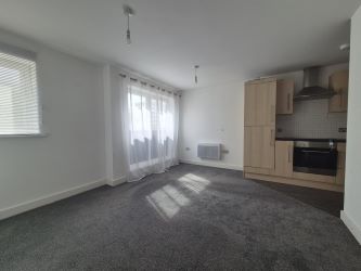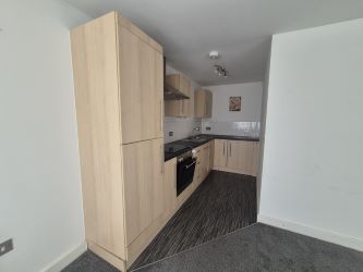 An L-shaped room with a double-glazed window and double-glazed floor-to-ceiling window facing the front aspect, offering ample natural light. The room is spacious with a kitchen area located in the rear corner, which has been fitted with a range of wall and base units with contrasting work surfaces. There is a built-in electric oven with a hob, a stainless steel extractor canopy above, and a single drainer sink inset with a mixer tap over. Fitted with two wall-mounted electric heaters.