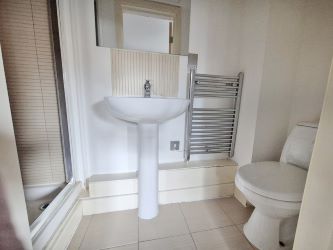 Fitted with a three-piece suite in white comprising a pedestal basin with mixer tap, a enclosed bath and a low flush WC. The bathroom is heated via a chrome-effect towel radiator.