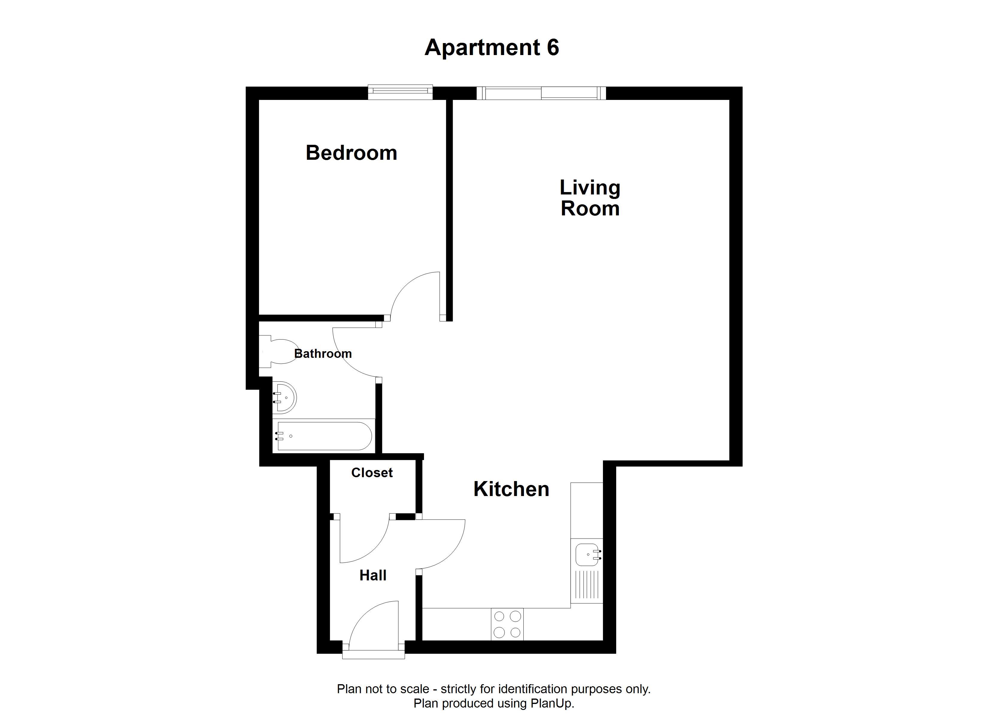 The accommodation comprises: entrance vestibule with cupboard, open plan living space and kitchen, a double bedroom and a bathroom.