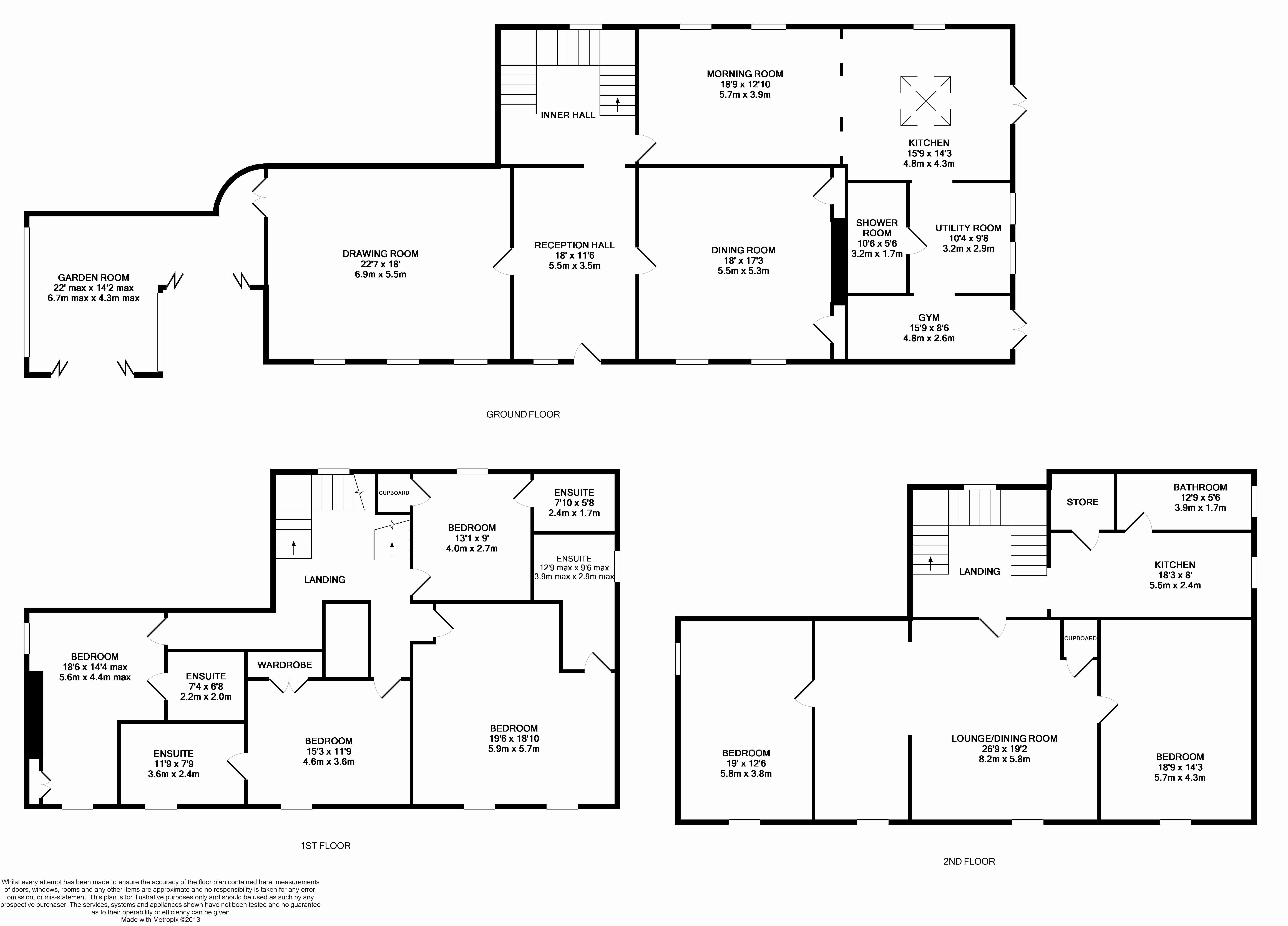Accommodation includes multiple reception rooms, a large kitchen with morning and utility rooms, and a gym. Upstairs features six well proportioned bedrooms, four with ensuites, plus an additional kitchen, lounge/dining area, and family bathroom.