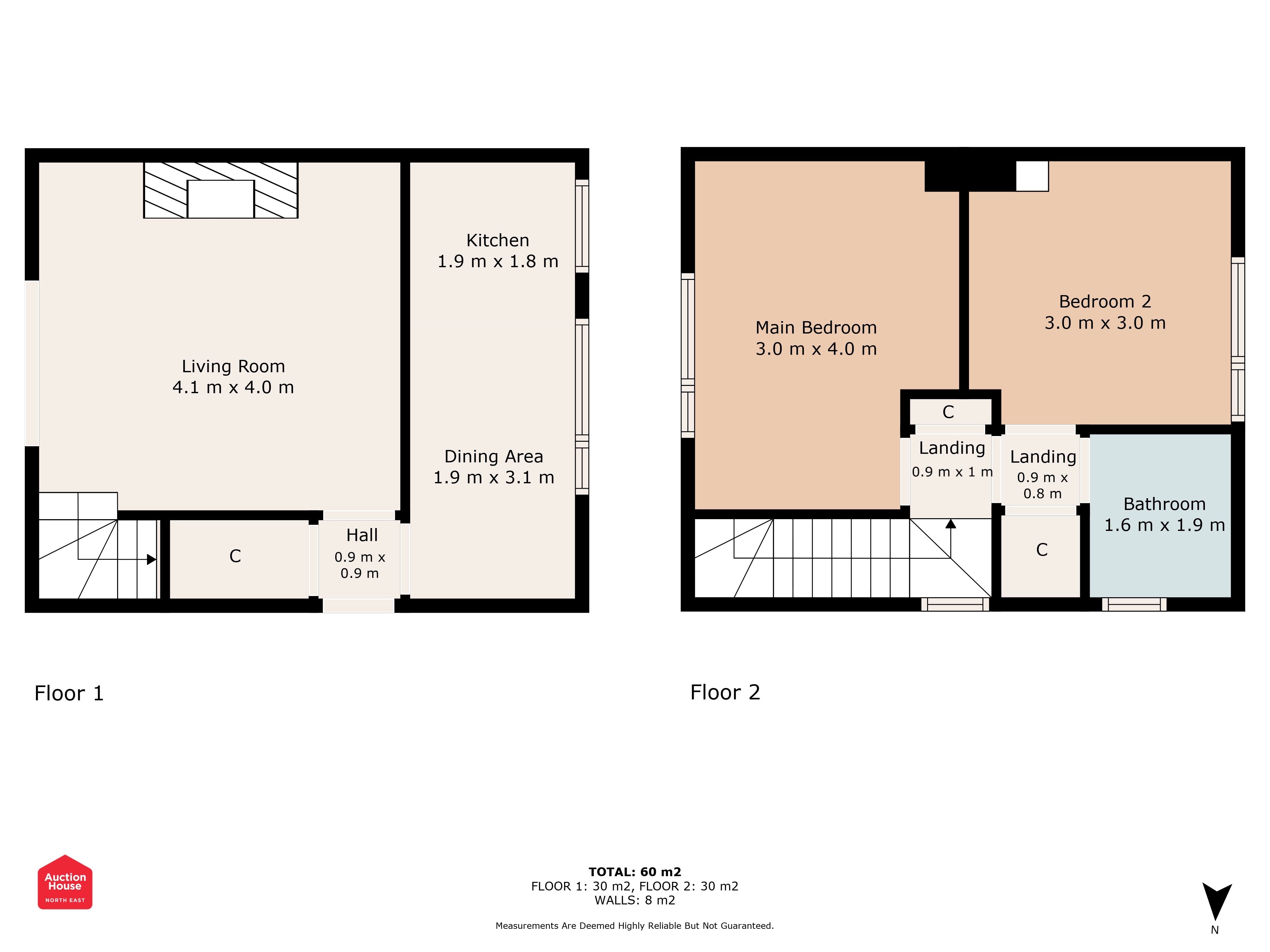 The internal layout offers well proportioned accommodation across two floors, including a spacious living room, dining area, and kitchen on the ground floor. Upstairs, there are two double bedrooms, a bathroom, and a landing space.