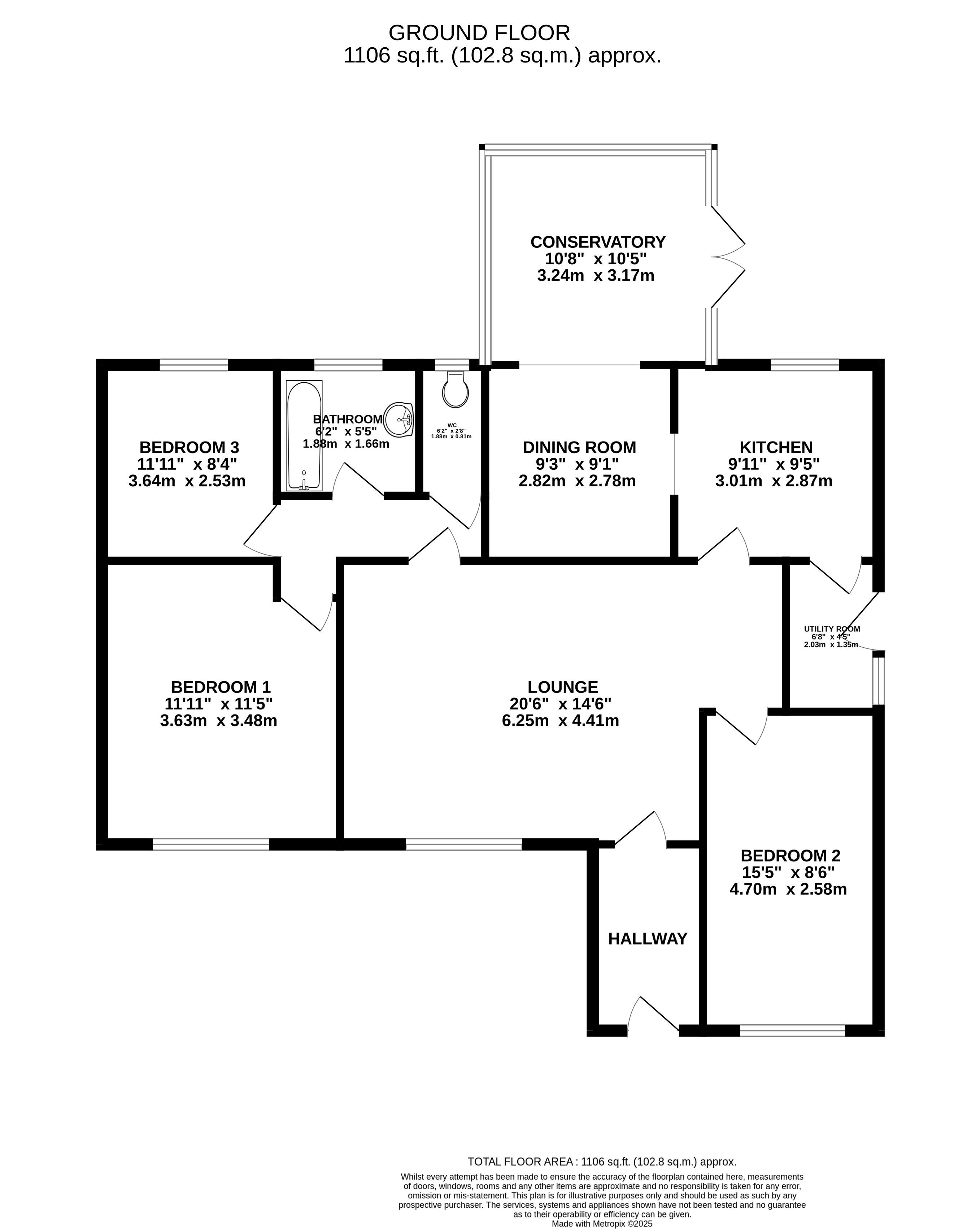 Ground Floor Porch, Lounge 6.25m max x 4.41m max, Dining room 2.82m x 2.78m, Conservatory 3.24m x 3.17m, Kitchen 3.01m x 2.87m, Utility Room 2.23m x 1.35m, Bedroom 1 3.63m x 3.48m, Bedroom 2 4.70m x 2.58m, Bedroom 3 3.64m x 2.53m, Bathroom 1.66m x 1.88m, WC 1.88m x 0.88m