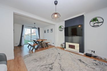The accommodation comprises an entrance porch leading to a hallway with staircase and understairs storage. The lounge/dining area features wood laminate flooring, an electric fire, and sliding doors that open directly onto a large enclosed rear garden. The modern fitted kitchen is equipped with integrated appliances, including a washing machine, dishwasher, fridge/freezer, built-in electric oven, and gas hob with extractor fan.