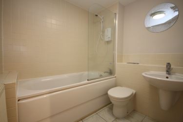 Bath with glass screen, mixer tap and electric shower over, wash hand basin with mixer tap over, low level w.c., extractor fan, tiled floor and walls.
