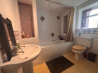 Three piece bathroom suite comprising hand held shower over bath, pedestal basin and WC with window to the side elevation and wall mounted radiator.