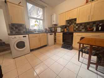 Fitted kitchen with wall and base units, sink under window overlooking rear courtyard, integrated oven, hob and concealed extractor above, space for appliances, wall mounted combi boiler. Wall mounted radiator, space for dining table and door into: