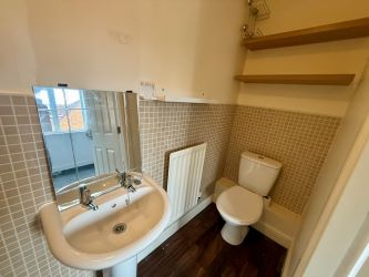 The accommodation is set over three floors and includes a generously sized kitchen and dining area fitted with wood-effect units, a built-in oven with gas hob, and French doors leading directly out to the garden. A ground floor cloakroom adds convenience, while the first-floor living room is bright and welcoming, with a Juliet balcony and modern décor.