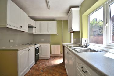 -Good-sized kitchen (10’6” x 8’10”) with fitted wall and base units, work surfaces, stainless steel sink, oven housing, and access to the rear garden.
